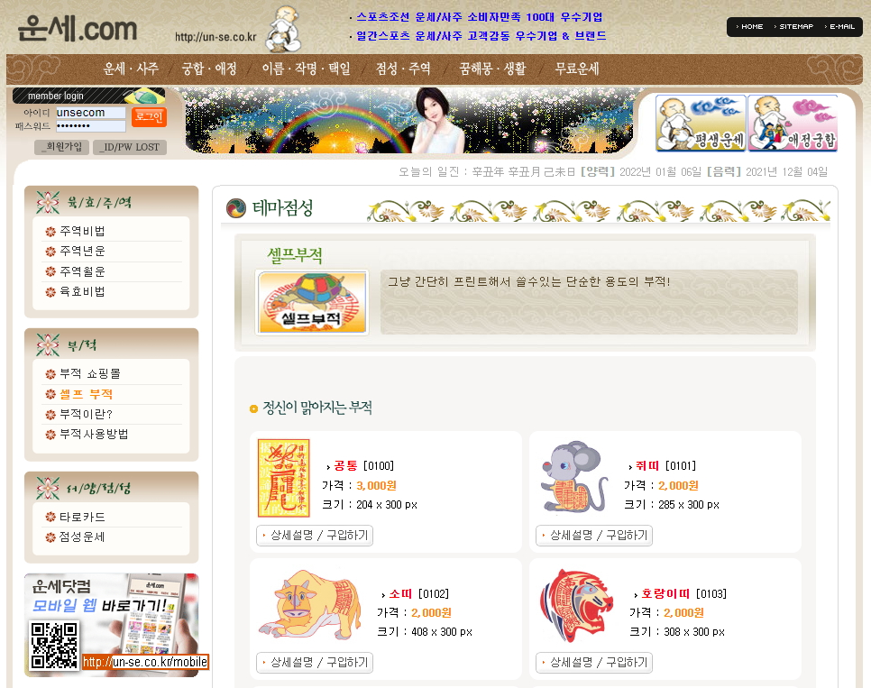 신년 운세를 보실 수 있으며 그 외 여러가지 애정운, 인생운, 사업운등 많은 운세보기가 준비되어 있습니다.