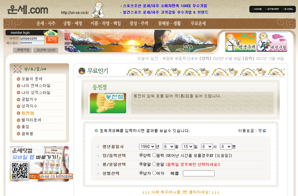 인터넷사주 길(吉)·흉(凶) 판단 무료 인터넷사주 보기 https://www.asiae.co.kr/fortune/ 사주나 운세를 풀어보고자 하는 사람들은 인터넷사주 사이트를 자주 이용한다.