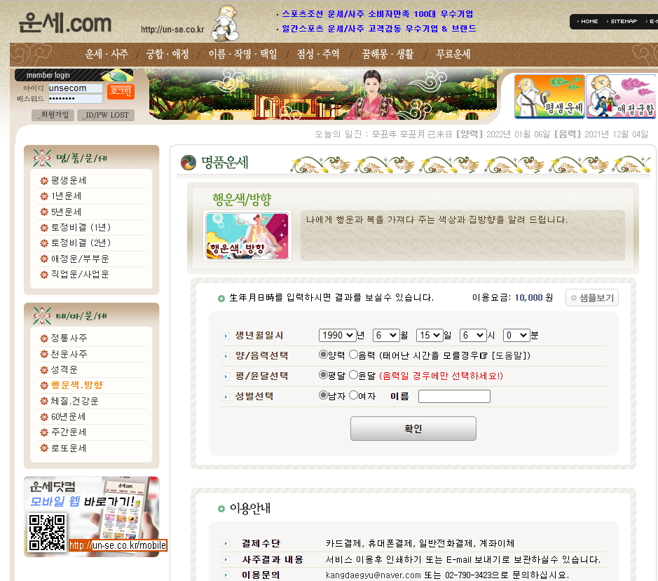 신년 운세를 보실 수 있으며 그 외 여러가지 애정운, 인생운, 사업운등 많은 운세보기가 준비되어 있습니다.