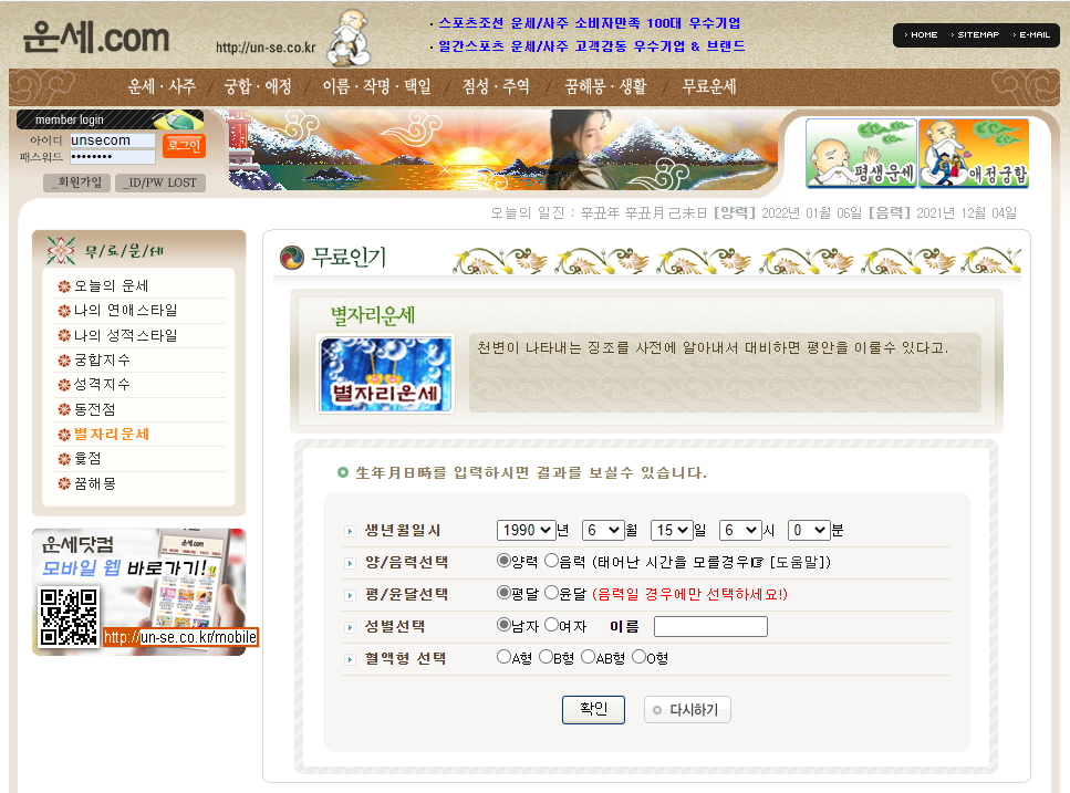 운세닷컴, 운세.com, 무료운세, 사주, 궁합, 토정비결, 이름풀이, 오늘의운세, 꿈해몽, … 오늘의운세를 총운, 재물, 애정, 가정, 복권 별로 풀이해 드립니다.